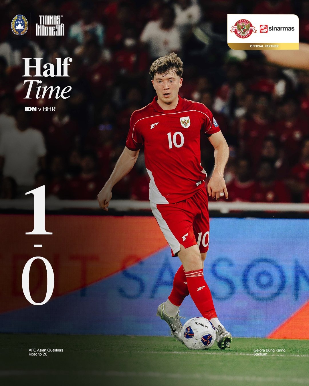 伤停补时1分钟。上半场比赛结束,印尼1-0巴林。