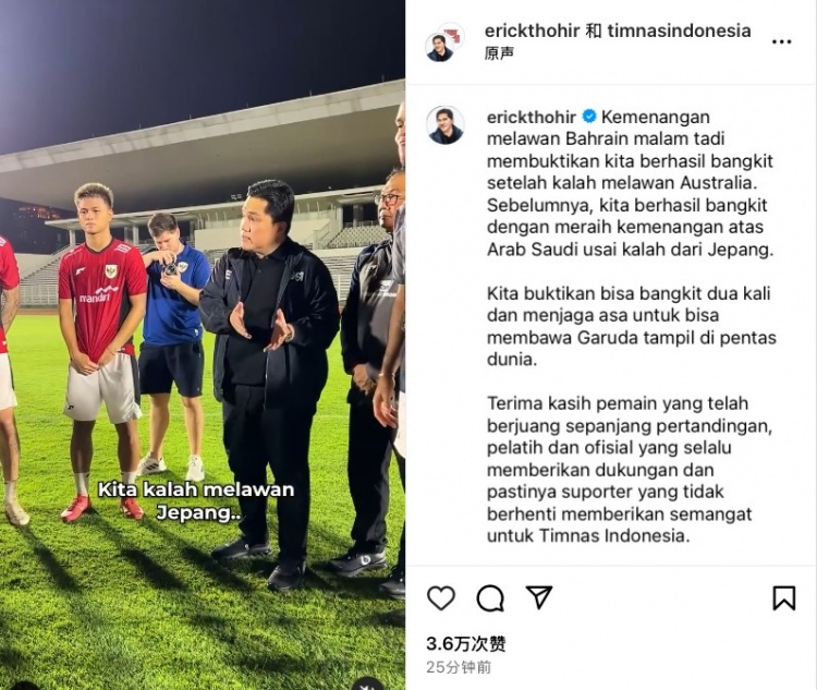印尼足协主席托希尔在发社媒,这次他晒出了赛后他召集球员进行训话的Vlog,视频中托希尔说道:“此前我们在0-4惨败日本队后,回到主场我们2-0击败沙特队;今天的情况类似,上轮我们惨败后今天我们又击败了巴林队。我希望你们接下来能继续全力以赴。另外,我相信我们还在计划当中:我们依旧保留通往世界杯的希望。”