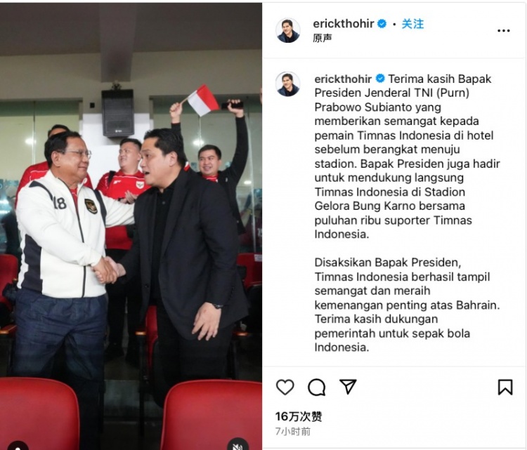 赛后印尼足协主席托希尔更新社媒,晒出了印尼总统苏比延多亲临现场观战的Vlog,并配文写道: